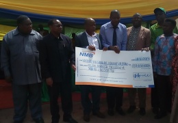 Mkuu wa Wilaya ya Mbinga Mh. Cosmas Nyshenye akikabidhiwa hundi na Afisa masoko wa NMB Bwn Baraka Mwabulesi wakati wa uzinduzi wa Ugawaji wa fedha kwa vikundi vya Wanawake,Vijana na Walemavu.Jumla ya ...